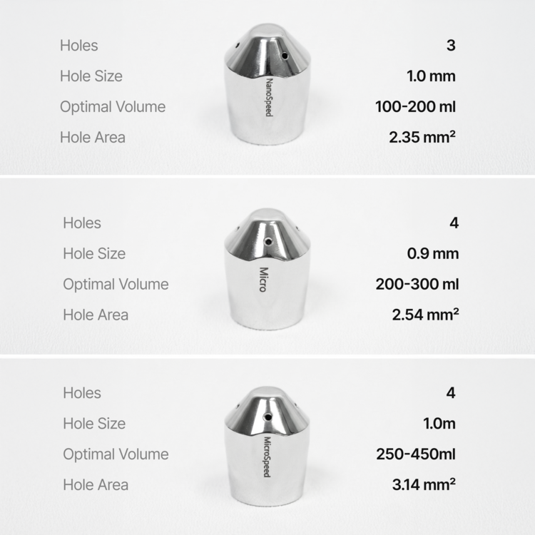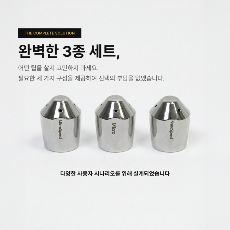 3종 세트: 사용하는 피처 사이즈, 우유의 양, 메뉴 구성에 맞춘 NANO SPEED / MICRO / MICRO SPEED 3종 구성으로 모든 스티밍 환경에 최적화되었습니다.